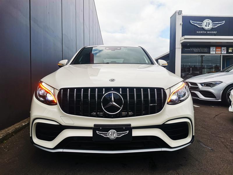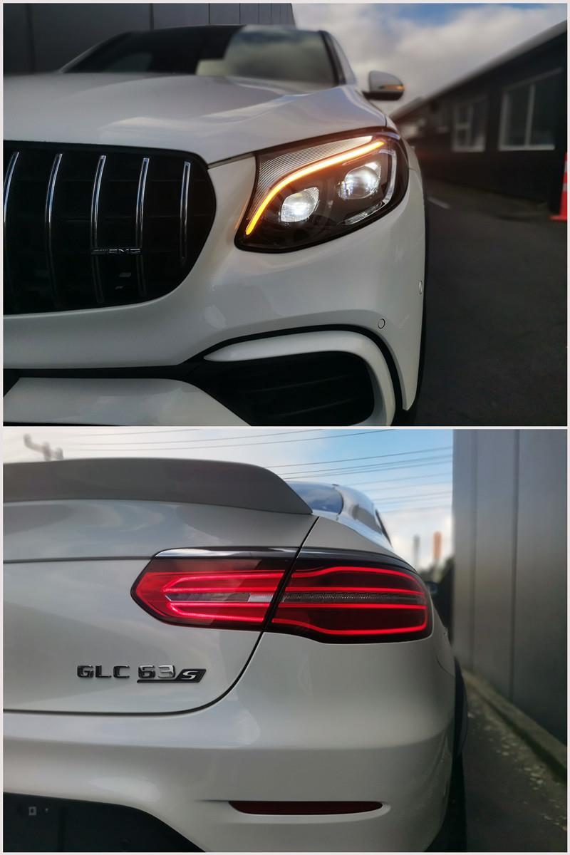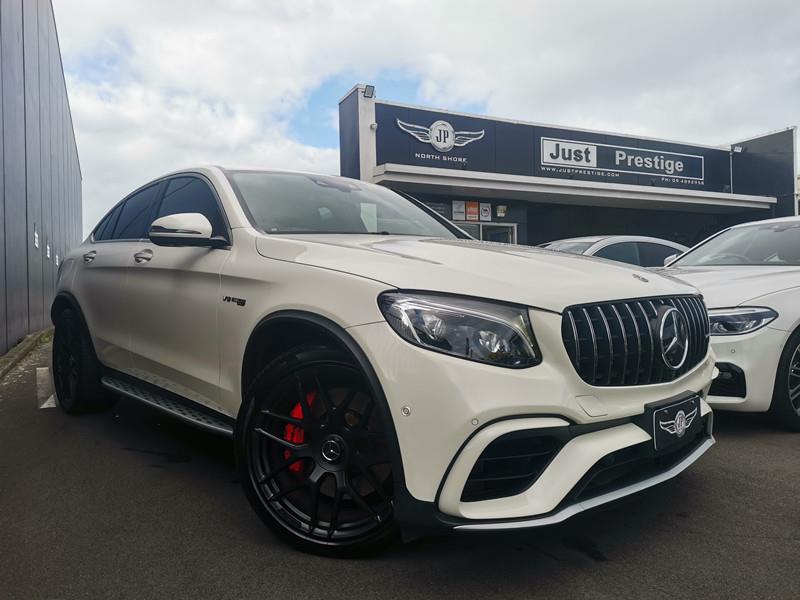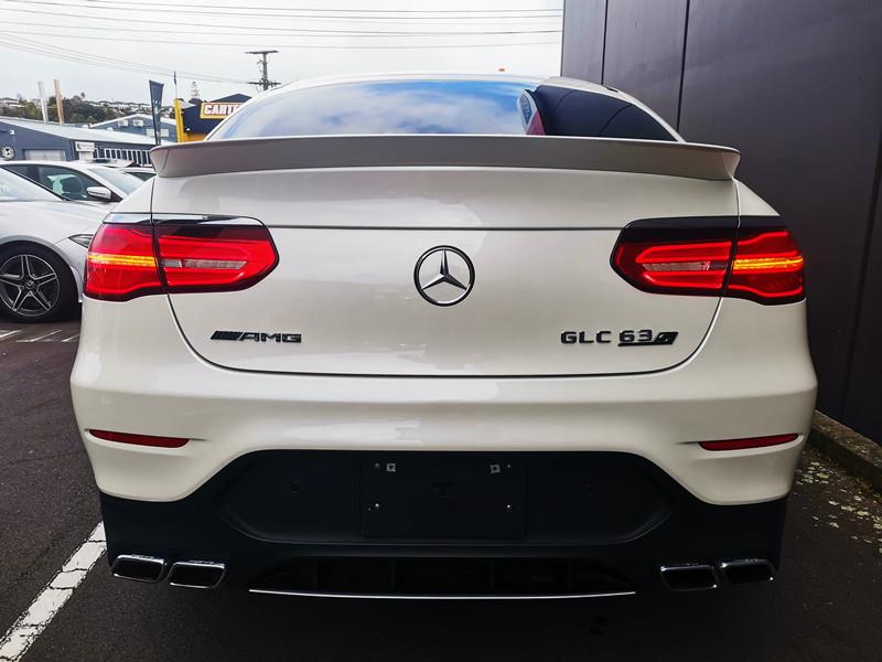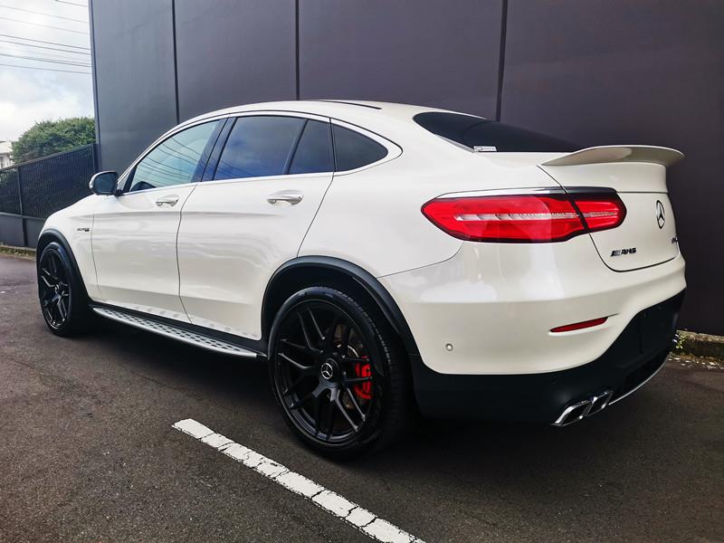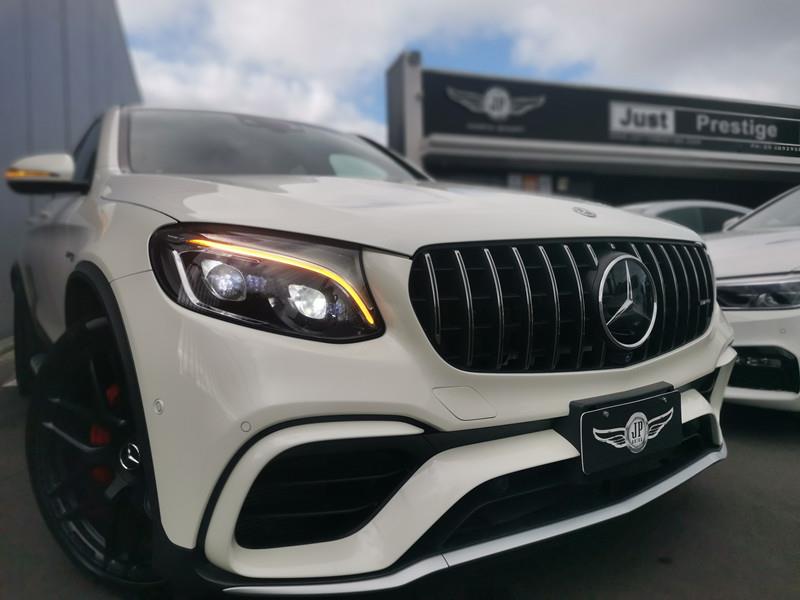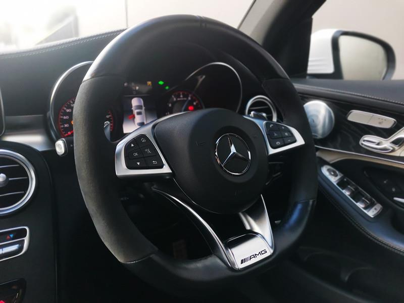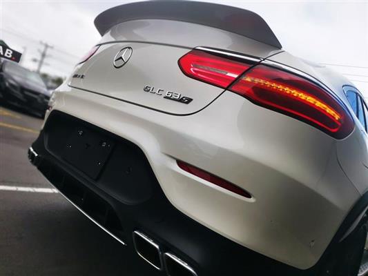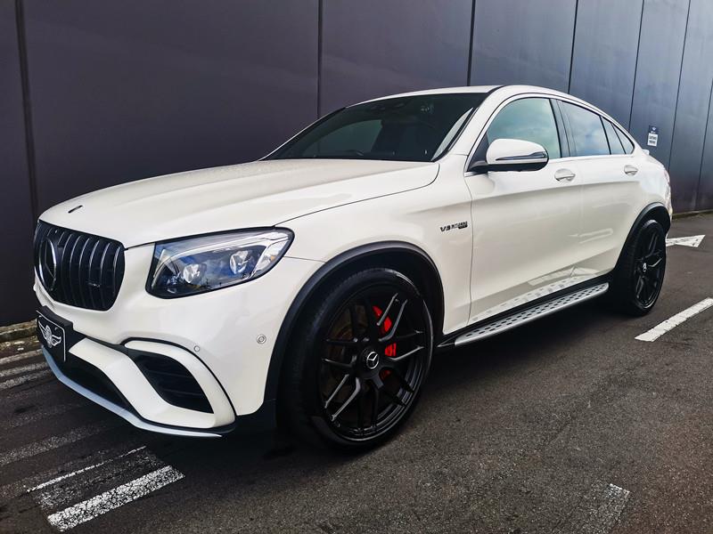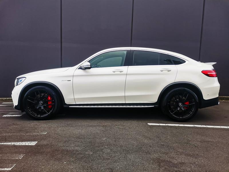 The Mercedes-AMG GLC 63 S Coupe is a high-performance SUV coupe with a 4.0L twin-turbo V8 producing 503 hp, capable of 0–100 km/h in just 3.8 seconds. It features AMG 4MATIC+ all-wheel drive, a 9-speed automatic transmission, and sits on striking 21-inch AMG alloy wheels with red brake calipers, combining a sporty yet practical design.
