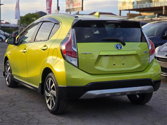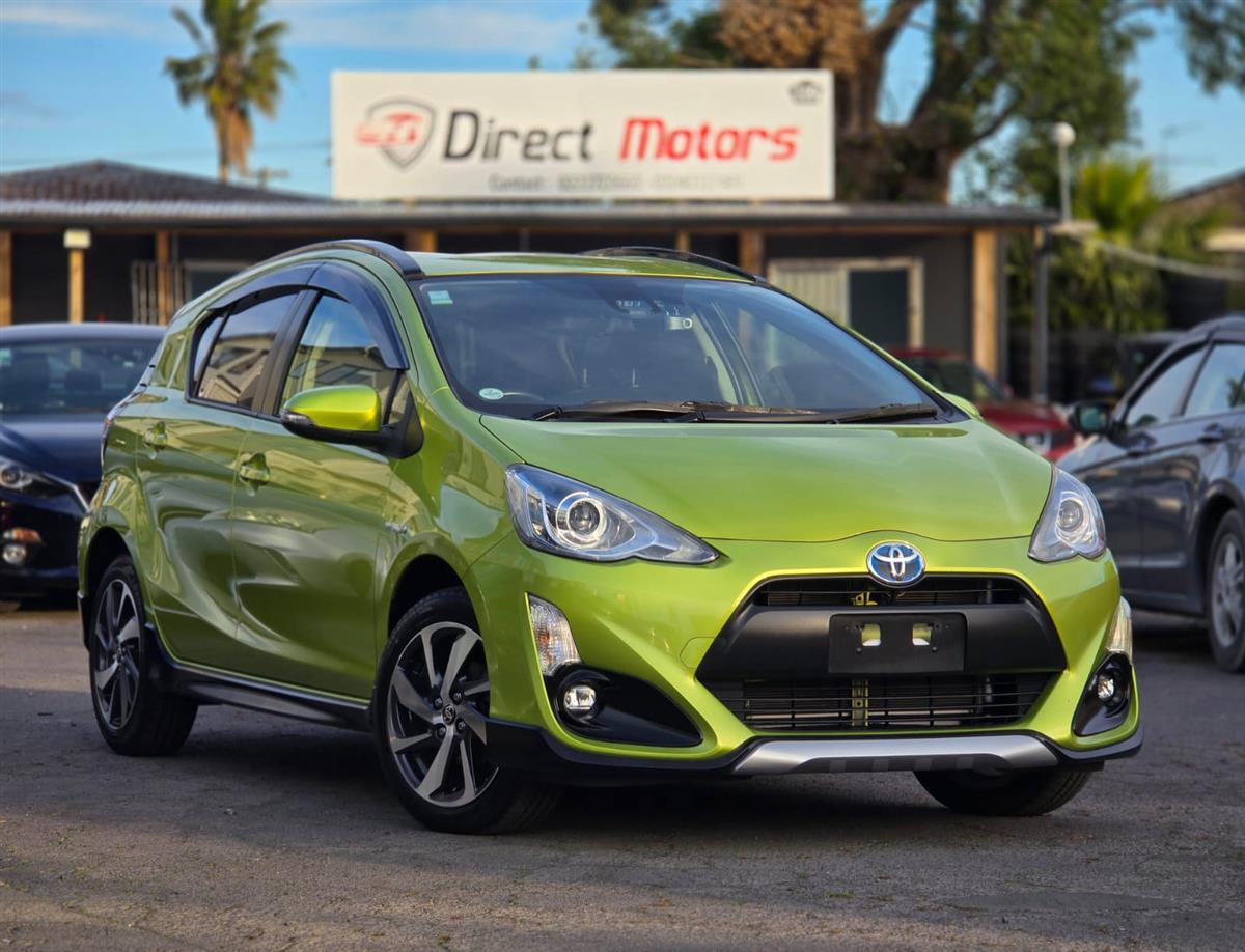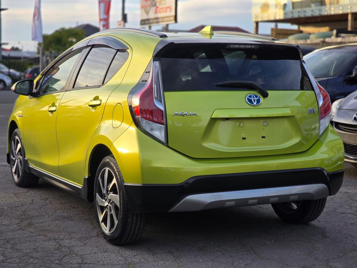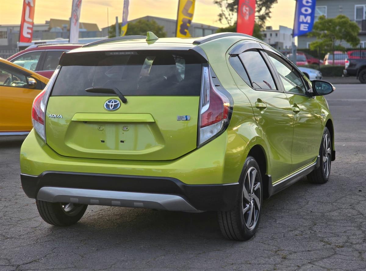 Turn heads with this stylish 2015 Toyota Aqua Green X-Urban Hybrid, combining sporty looks with outstanding fuel efficiency. Enjoy modern features like Push Start, Lane Assist, Collision Control, and a Reversing Camera for added confidence on the road. With Machine Face Factory Alloys, Fog Lights, and Half Leather Seats, this Aqua delivers the perfect mix of comfort, safety, and style.
