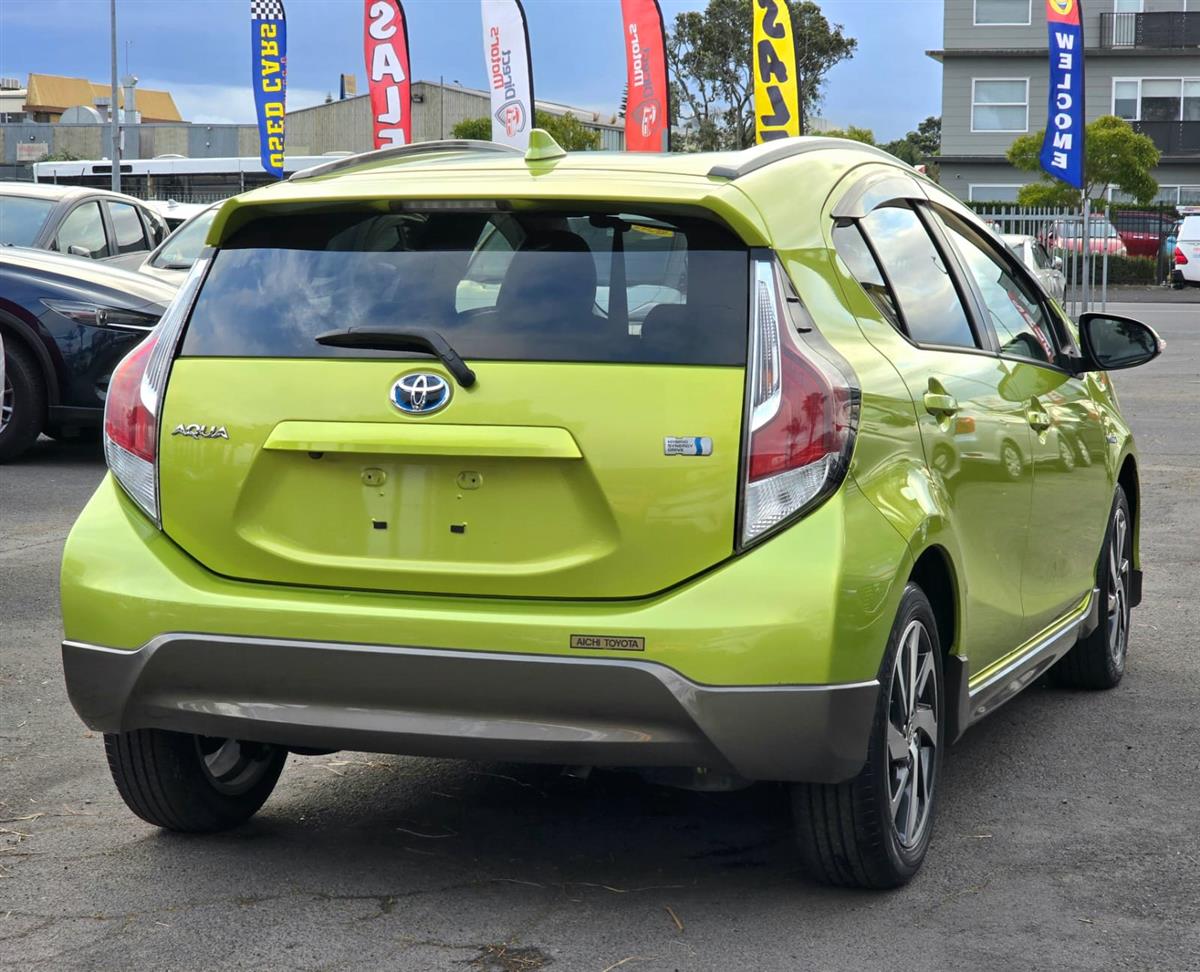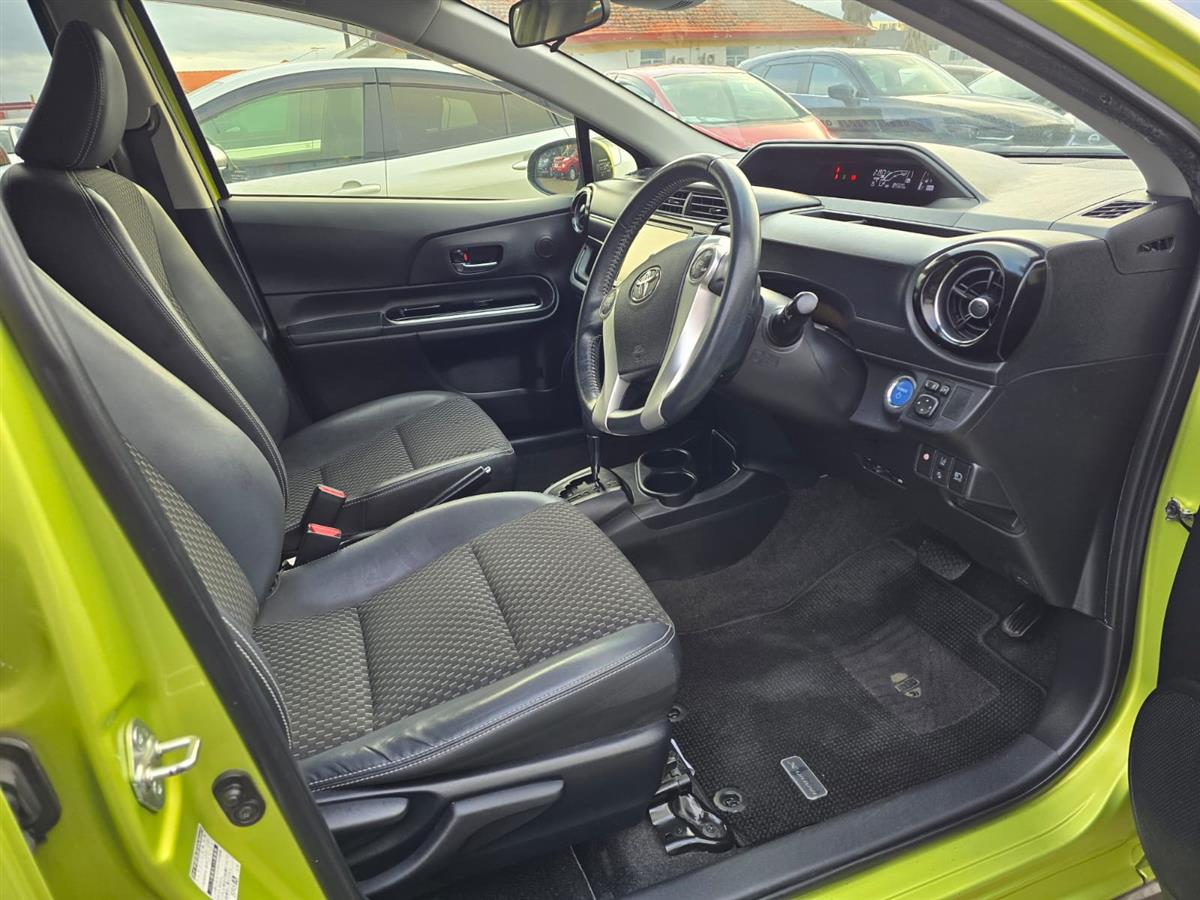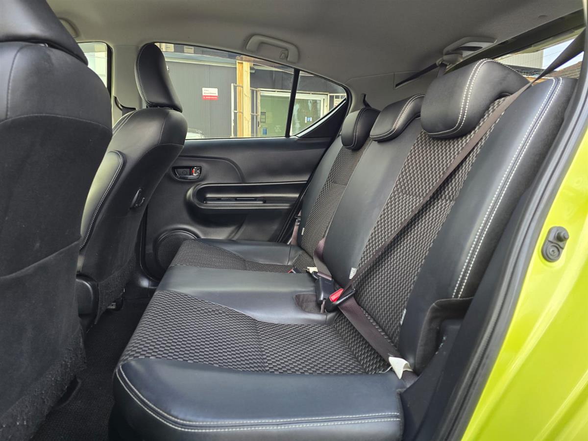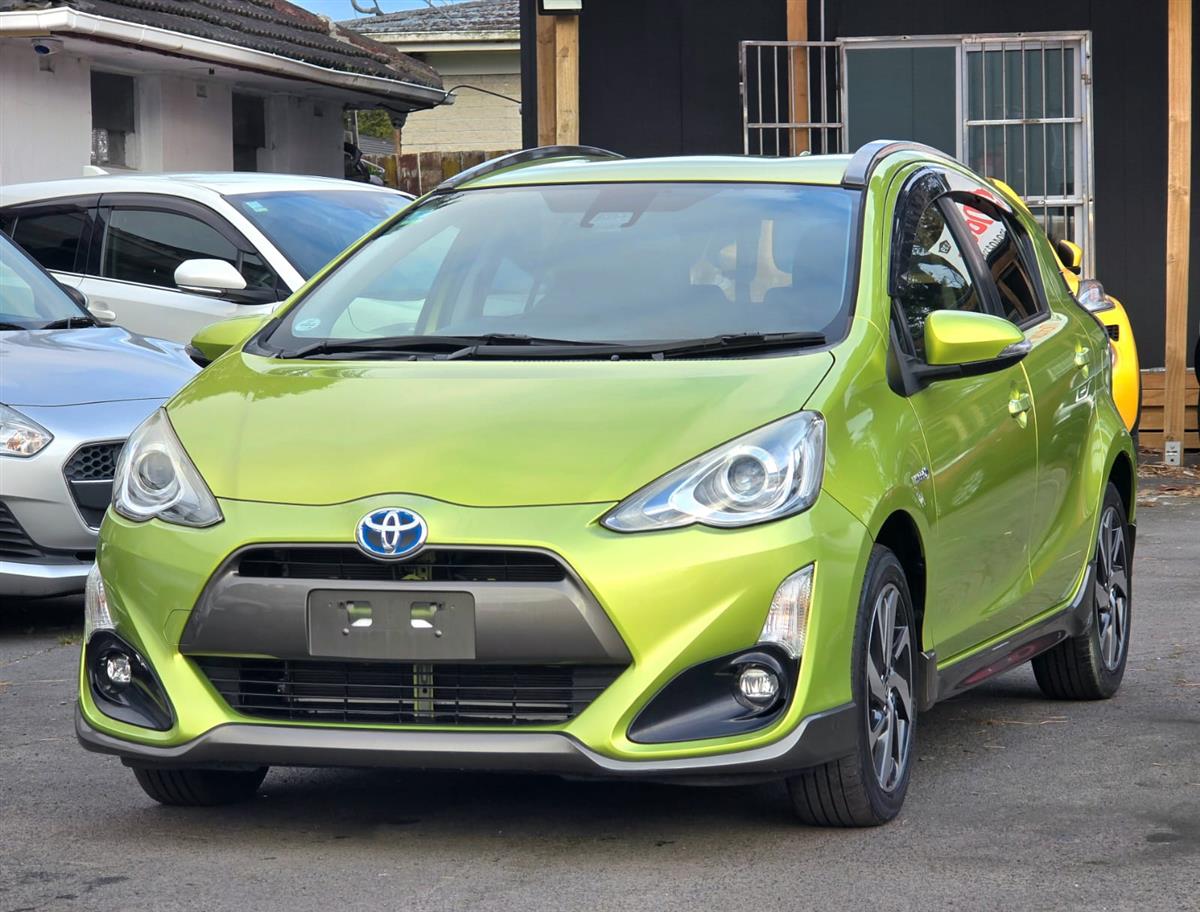 The 2016 Toyota Aqua Green X-Urban combines sporty styling with advanced safety features like Lane Assist and Collision Control for peace of mind on every drive. Inside, enjoy premium comfort with Half Leather & Heating Seats, Push Start, and a Reversing Camera for effortless convenience. Finished with Machine Face Factory Alloys and Fog Lights, this hybrid delivers style, safety, and fuel efficiency all in one package.